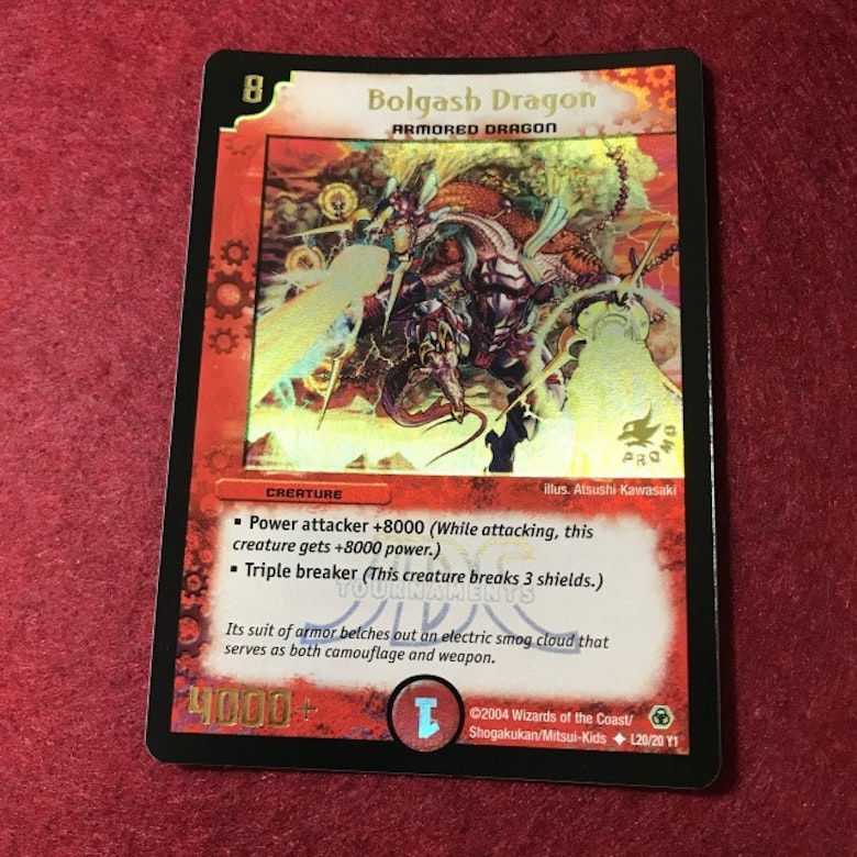 基本編~闘魂編に思い入れのある方であれば、きっとこのカードにも思い出がある事でしょう!6コスト以上の大型クリーチャーが軒並み光り物であった中、DM-03にはレアで、最初期の「勝舞火炎デッキ」にも収録されていた事から、入手性が良く特に始めたての頃の切札ドラゴンとして使っていた方が多いカードです! 7マナ9000のWブレイカーと淡白なスペックですが、逆にデメリットも無く、素のパワーが高い為殴り返しにも強かったですね。ゲーム的にはあまり強いカードとは言えないカードかもしれませんが、「良いカード」ではあると思います。 海外版ではJDCプロモとして配布されており、もちろん他のカードと同様に箔押し+ホイルの豪華仕様となっております。さぞかし海外の子供達にもよく使われていたのでしょう... 希少度:★★★ 人気度:★★★★ 実用性:★★ 総合評価:★★★★