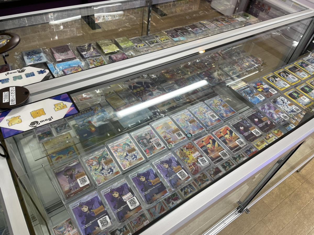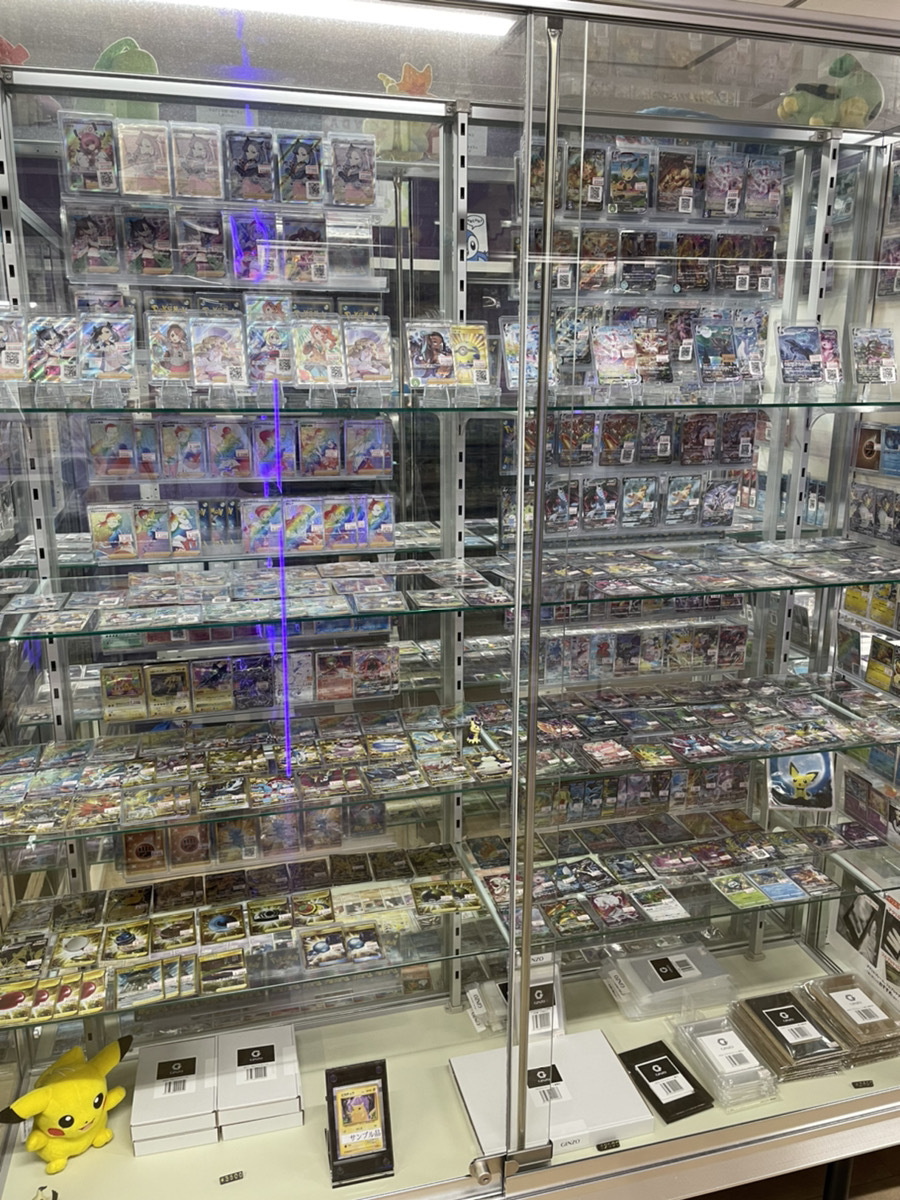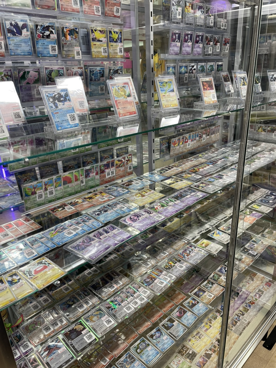 他の駅にあるポケモンカード専門店に比べ、よりコレクター向けトレカの取り扱いを重視しております。他店では品薄になりがちな旧裏~XY、XY BREAKの時代におけるポケモンカードを取り揃え、ショーケースを古い時代専用で複数設置致します。また、現在では手に入りにくい昔の未開封パックなどを実物で見るだけでも懐かしい気持ちに浸ることができます。