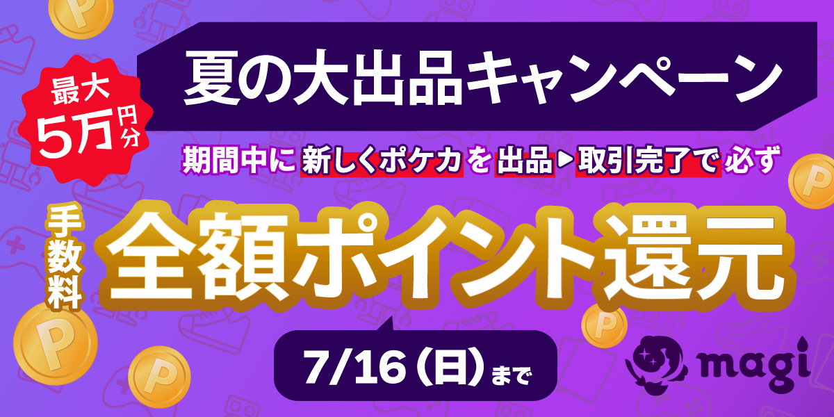 いつもmagiをご利用いただきありがとうございます! magi運営事務局でございます。このたび以下のキャンペーンを実施いたします。 ■概要・参加条件 以下の条件を全て満たす商品を出品し売れた場合、出品取引手数料の全額をポイント還元いたします。 ・対象商品が「ポケモンカードゲーム」カテゴリーの商品であること ・キャンペーン期間中に新しく出品・購入され、取引が完了となった商品であること 以下キャンペーン参加申込フォームでの参加登録が必要となります。 キャンペーン参加申込フォームはこちら ■キャンペーン詳細 ・お一人様がもらえるポイントの上限は50,000ポイントです ・以下の様な出品はポイント付与対象外となり、事務局が悪質と判断した場合は、アカウントの停止などの対応をさせていただきます。 - 商品名、商品画像が正しく設定されていない出品 - 商品価格が相場から乖離した出品 - 商品名、商品画像からキャンペーン条件を満たすことが判別できない出品 - 実際の商品と異なるカテゴリ、ブランドへの出品 - 専用出品 - その他、事務局が不適切と判断した出品 ■キャンペーン期間 出品期限、申込フォームでの参加登録期限:2023/7/6(木)19:00〜2023/7/16(日)23:59 取引完了期限:2023/7/30(日)23:59 還元ポイントを付与する日程は2023年8月上旬を予定しております。 ■その他注意事項 ・不正行為、複数アカウントを用いてポイントを受け取るために架空の出品や、実際の取引を装った手渡しでの知人間、親族間での取引、同一ユーザー間での不自然な連続した取引などの運営上の趣旨に反していると弊社が判断した行為が行われた場合はポイント付与対象外とし、アカウントの停止などの対応をさせていただきます。 ・キャンペーンへの参加を目的とした、売却意思のない出品や在庫がない商品の出品は付与対象外とし、アカウントの停止などの対応をさせていただきます。 ・キャンペーン期間前に既に出品されていた商品情報を編集した場合は出品とはみなされないためご注意ください。 ・ポイント付与時点で、退会されているお客様のポイント、また利用規約違反の商品に関するポイントは付与対象外となります。 ・magiポイントは1ポイント=1円として1ポイントからmagiでの購入に利用できるもので、有効期限は付与日から150日間です。 ・本キャンペーンは予告なく変更・中止する場合がございます。 ・本キャンペーンは株式会社ジラフ「magi」が主催しているものです。 ご不明点などございましたら、お問い合わせよりご連絡ください。 お問い合わせは、アプリ左上メニュー→「お問い合わせ」からご利用いただけます。 引き続き、magiをよろしくお願いいたします。