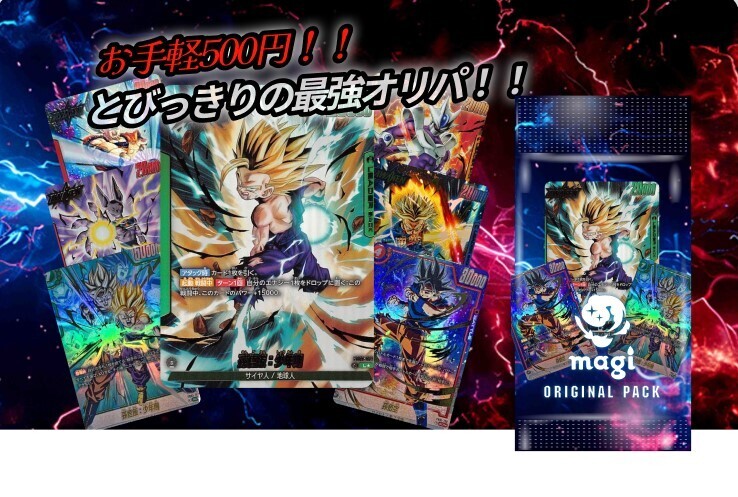 いつもmagiをご利用いただきありがとうございます! magi運営事務局でございます。 お手軽500円!! とびっきりの最強オリパ!!を新発売いたします。 オリパで当選するカードの一例はこちらです! 【1等】 【2等】 孫悟空(パラレル) SCR★ FB01-139 孫悟飯:少年期(パラレル) SCR★ FB01-140 ビルス|ビルス(パラレル) L★ FB01-002 など! その他販売しているオリパはこちらから確認ください 当選したカードは¥500 OFFクーポンに変換することもできます。 クーポン還元率100%のお得なオリパなので、ぜひ挑戦してみてください!