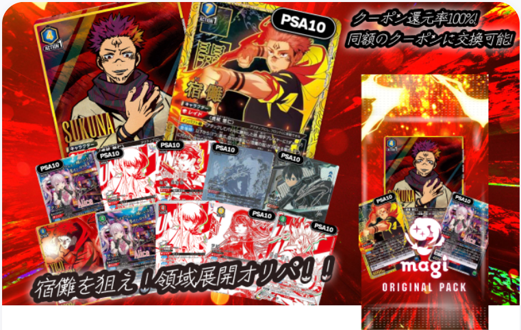 いつもmagiをご利用いただきありがとうございます! magi運営事務局でございます。 宿儺を狙え!領域展開オリパ!!を新発売いたします。 オリパで収録されているカードの一例はこちらです! 【1等】 宿儺 (OBC){1-105}(UAPR-JJK) 【PSA10】宿儺 (SR★★★){3-015}(EX04BT-JJK) 【2等】 【PSA10】 アリス (SR★★){1-070}(UA18BT-NIK) などこの他にも魅力的なカードを揃えました! その他販売しているオリパはこちらから確認ください 当選したカードは¥25,000 OFFクーポンに変換することもできます。 クーポン還元率100%のお得なオリパなので、ぜひ挑戦してみてください!