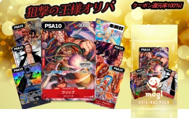 いつもmagiをご利用いただきありがとうございます! magi運営事務局でございます。 狙撃の王様オリパを新発売いたします。 オリパで当選するカードの一例はこちらです! 【1等】 【PSA10】ウソップ(CS/illust:phima)【R】{OP01-004} 【2等】 【PSA10】 ポートガス・D・エース SR パラレル 漫画背景(OP02-013) 【PSA10】サボ SR パラレル 漫画背景(OP04-083) 【PSA10】シャンクス SEC パラレル 漫画背景(OP01-120) などこの他にも魅力的なカードを揃えました!! その他販売しているオリパはこちらから確認ください 当選したカードは¥40,000OFFクーポンに変換することもできます。 クーポン還元率100%のお得なオリパなので、ぜひ挑戦してみてください!