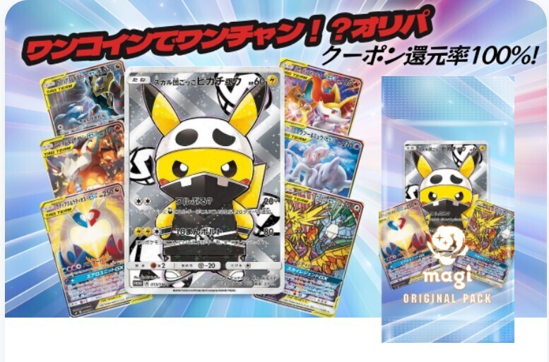 いつもmagiをご利用いただきありがとうございます! magi運営事務局でございます。 ワンコインでワンチャン!?オリパを新発売いたします。 オリパで当選するカードの一例はこちらです! 【1等】 スカル団ごっこピカチュウ PROMO 013/SM-P ラティアス&ラティオスGX SR 105/095 ファイヤー&サンダー&フリーザーGX SR 060/054 などこの他にも魅力的なカードを揃えました! その他販売しているオリパはこちらから確認ください 当選したカードは¥500OFFクーポンに変換することもできます。 クーポン還元率100%のお得なオリパなので、ぜひ挑戦してみてください!